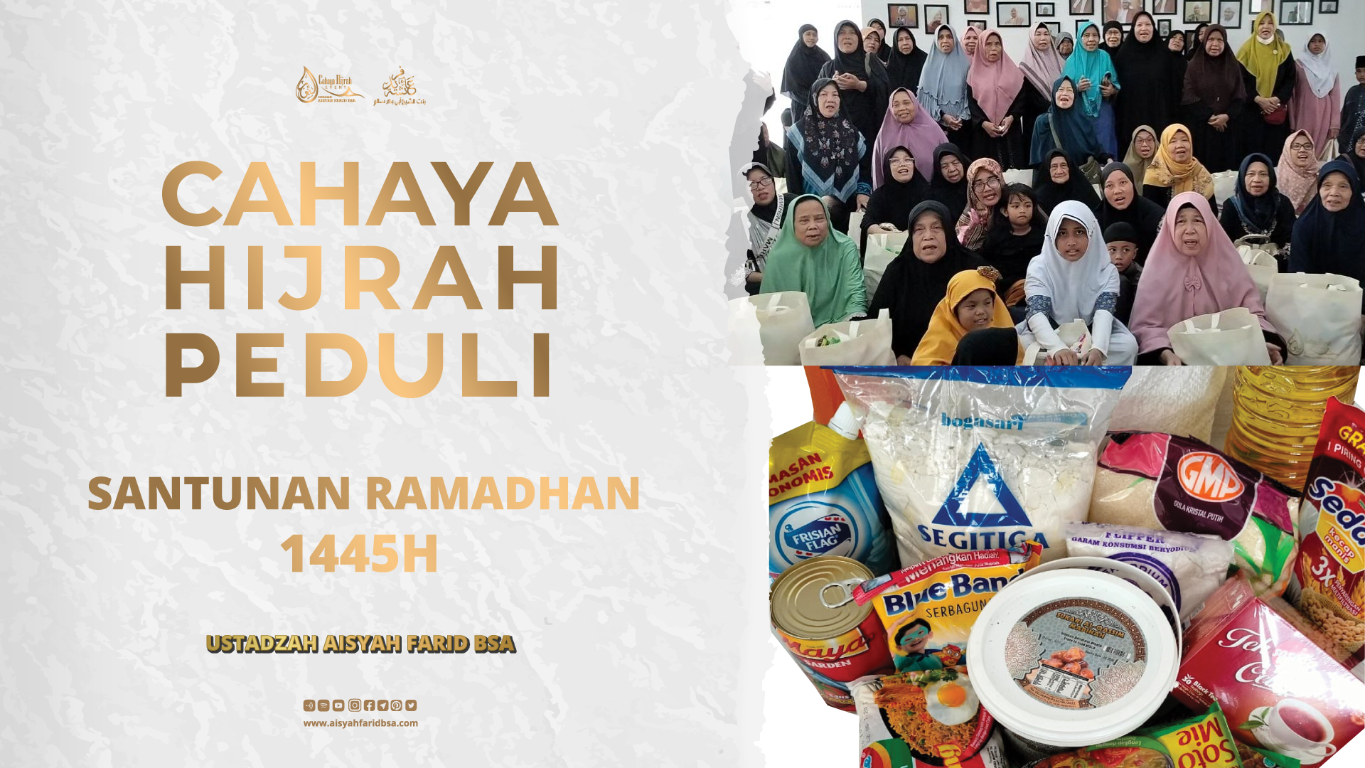 Kegiatan Sosial ini dipersiapkan sebagai Wadah Kepedulian antar ummat yang diperuntukkan bagi Yatim, Dhuafa, serta saudara khususnya sesama muslim yang tertimpa musibah atau bencana alam. CEO dari seorang motivator, inspirator, Guru Besar Ustadzah Aisyah Farid.